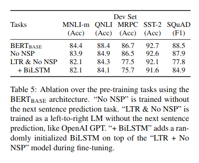 No NSP: A bidirectional model which is trained using the MLM but no next sentence prediction. This model shows to significantly hurt performance on QNLI, NMLI, and SQuAD 1.1