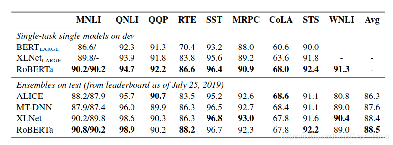 - RoBERTa achieves state of the art results on all 9 of the GLUE task development sets