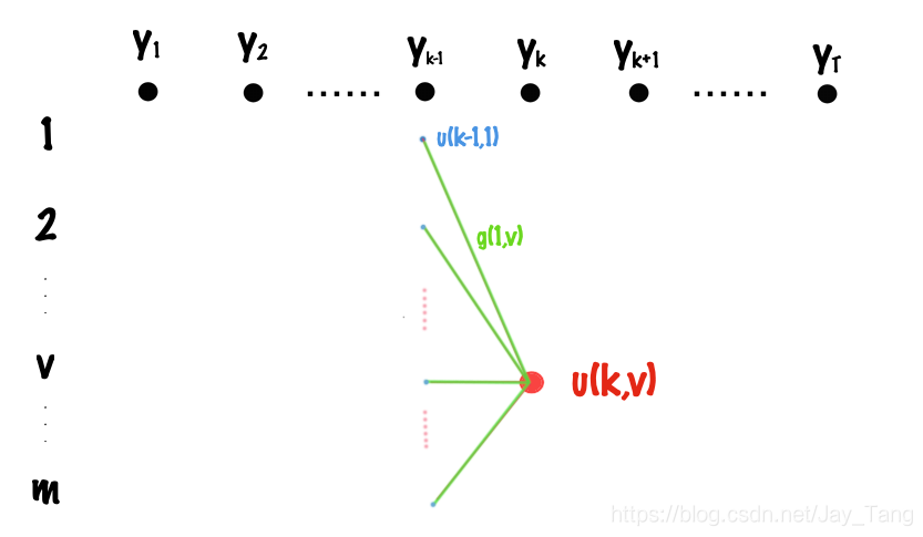 Let $u(k,v)$ denote the score of the best path from $t=1$ to $t=k$, where the tag of time $k$ is $v$. Then the recursion formula can be easily visualized from the above figure and we can write it as