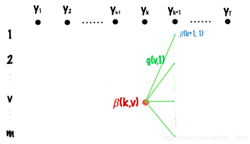 Let $\beta(k,v)$ denote the sum of all possible paths from $t=k$ to $t=T$, where the tag of time $t$ is $v$. Then the recursion formula can be easily visualized from the above figure and we can write it as