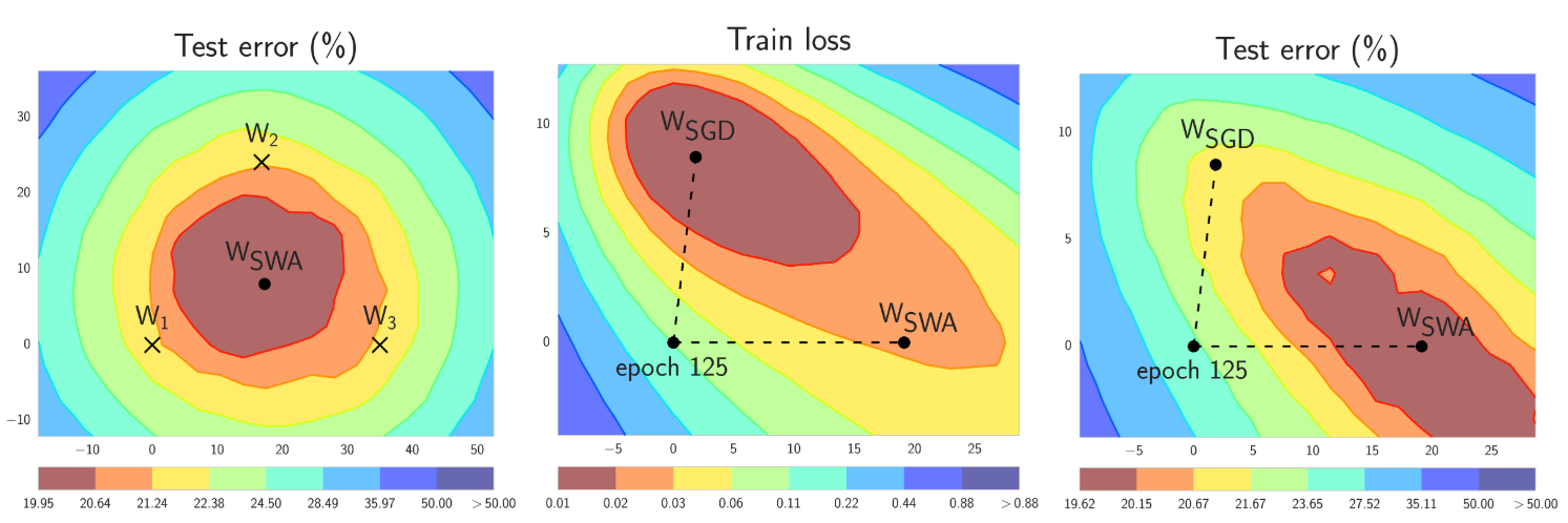In short, SWA performs an equal average of the weights traversed by SGD with a modified learning rate schedule. SWA solutions end up in the center of a wide flat region of loss, while SGD tends to converge to the boundary of the low-loss region, making it susceptible to the shift between train and test error surfaces (see the middle and right panels in the figure below):